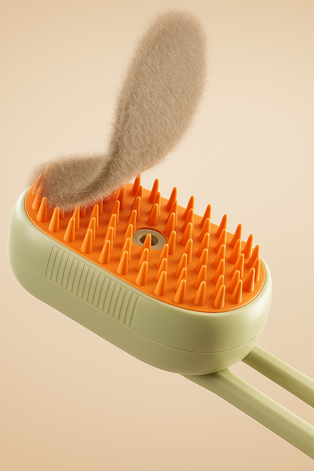 El cepillo 3 en 1 masajea, limpia y elimina el pelo muerto con un solo clic. Ideal para perros y gatos. Su spray integrado hidrata y deja el pelaje brillante.